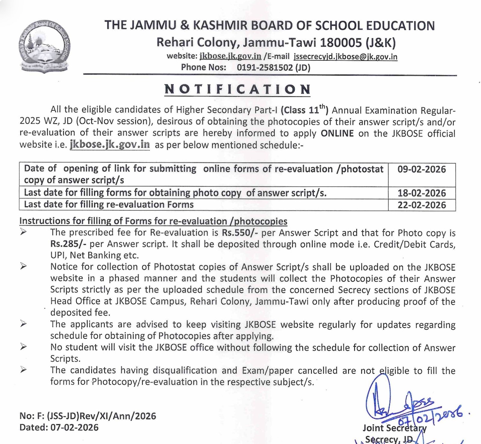- Students must collect photocopies strictly as per the notified schedule from the concerned Secrecy Sections at JKBOSE Head Office, Rehari Colony, Jammu-Tawi.